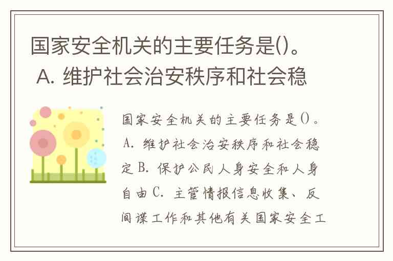 国家安全机关的主要任务是()。 A. 维护社会治安秩序和社会稳定 B. 保护公民人身安全和人身自由 C. 主管情报信息收集、反间谍工作和其他有关国家安全工作 D. 保护公共财产和个人合法财产不受侵犯
