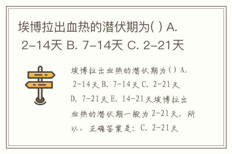 埃博拉出血热的潜伏期为( ) A. 2-14天 B. 7-14天 C. 2-21天 D. 7-21天 E. 14-21天