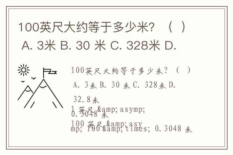 100英尺大约等于多少米?( ) A. 3米 B. 30 米 C. 328米 D. 32.8米1 英尺 ≈ 0.3048 米100 英尺 ≈ 100 × 0.3048 米 = 30.48 米