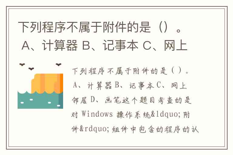 C、网上邻居(在较新版本中称为“网络”):这不是一个程序,而是系统提供的一个用于访问局域网内计算机和共享资源的功能图标/环境,它不属于“附件”程序组。