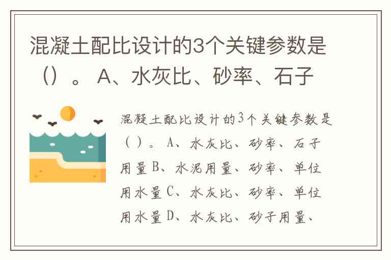 D、水灰比、砂子用量、单位用水量:砂子用量不是一个独立的关键参数,它由砂率和骨料总体积决定。
