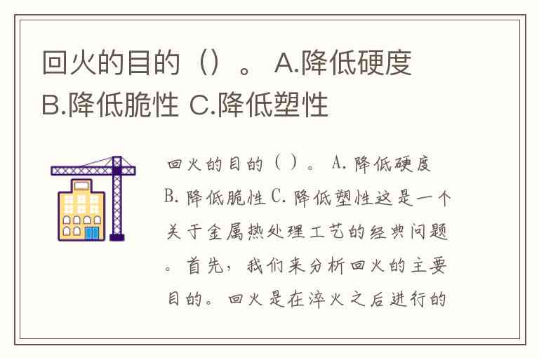 B. 降低脆性:这是回火最核心、最直接的目的之一。通过回火,可以消除内应力,提高材料的韧性和塑性,使其不再那么容易断裂。
