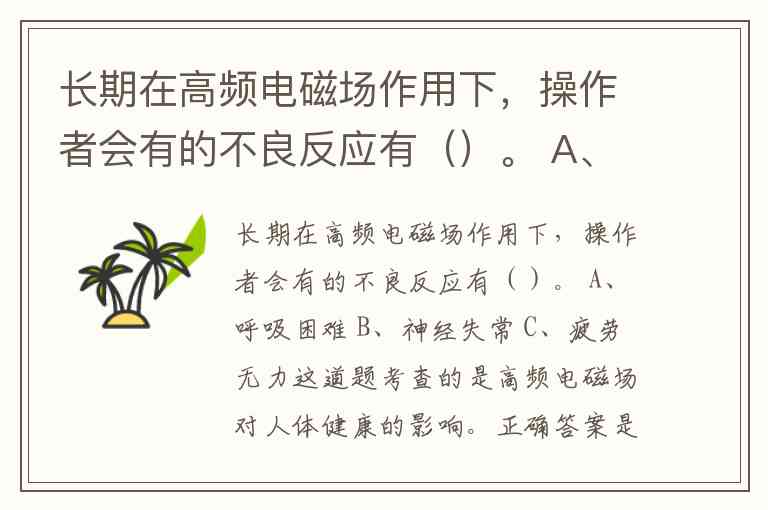 C、疲劳无力:这是长期暴露于高频电磁场下非常典型的不良反应。它属于神经系统和全身性的功能性症状,常伴有头晕、乏力、嗜睡等情况。