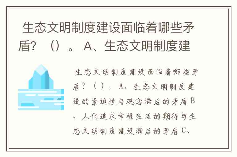 B、人们追求幸福生活的期待与生态文明制度建设滞后的矛盾:随着生活水平提高,公众对洁净的空气、水和宜居环境的需求日益强烈。然而,相关的法律制度、监管体系、市场机制等还不完善、不系统,无法充分满足人民群众对美好生态环境的期待。
