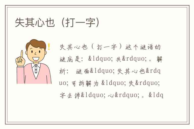 解析: 谜面“失其心也”可拆解为 “失”字去掉“心”。