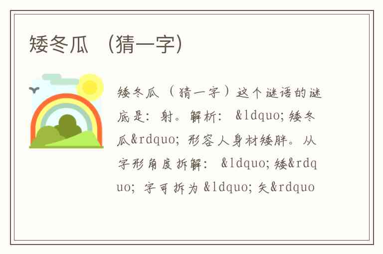实际上,常见解法是: “矮” 会意 “短”; “冬瓜” 形似 “瓜”,但“瓜”在字谜中常与“爪”或特定部分联想。