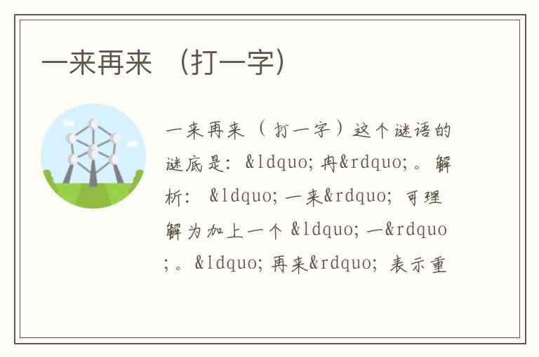 更直接的解释: “一” 来 → 加上“一”; “再” 来 → 再来一个“一”; 两个“一”与“丨”组合: 若两个“一”中间加“丨”,就是 “冉”(“冉” = “冂” 中间加一横,但“冂”可视为“一”和“丨”的组合变形)。