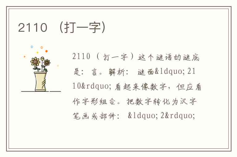 更常见的解法是: “2110” 视为 “二”“一”“一”“口” 叠成 “言” 字: “言” 的旧字形或楷书可拆为“亠”、“二”、“口”,但这里“二”“一”“一”“口”可以拼成“言”的上部“亠”加“二”加“口”吗? 其实“言”的上部是“亠”,中间是“二”,下部是“口”,正好对应“2(二)”“1(一,即亠的上横)”“1(一,即亠的下横?不通)”“0(口)”。