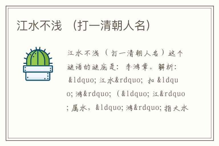 但综合来看,流传的谜底是 李鸿章,可能用的是“江水”会意“鸿”(大江大河的水势鸿大),“不浅”会意“章”(“章”通“彰”,显著、深厚之意),组合为“鸿章”。