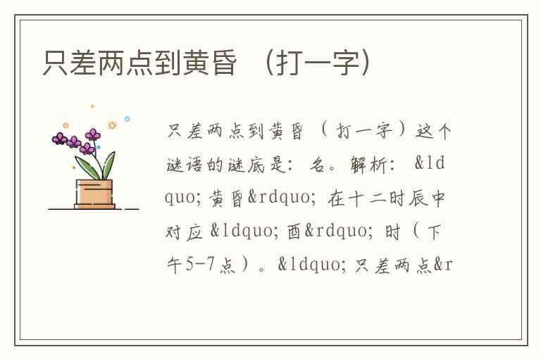 不过此谜的流行答案是 “名”,解释为: “黄昏”=“夕”, “只差两点”=“只”字去掉“八”(两点),剩下“口”, “口”+“夕”=“名”。