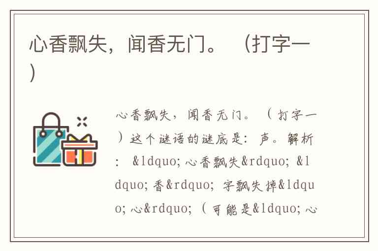 不过此谜标准答案是 “声”,解释为: “心香” 会意“声”(心香祭拜时默默出声?牵强), “闻香无门” 提示“闻”字无“门”是“耳”,但“声”里有“耳”吗? “声”的繁体“聲”有“耳”,简体“声”上部“士”,下部形似“眉”但无耳。