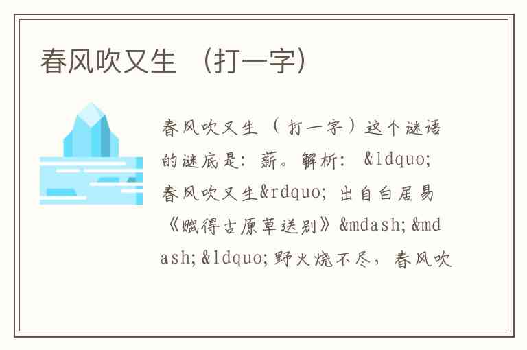 解析: “春风吹又生” 出自白居易《赋得古原草送别》——“野火烧不尽,春风吹又生”,形容草木生命力顽强。
