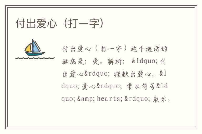 “受”字本义是接受,但这里从字形反推:“爫”+“冖”+“又”=“受”,谜面用“付出爱心”暗示“受”字的结构。