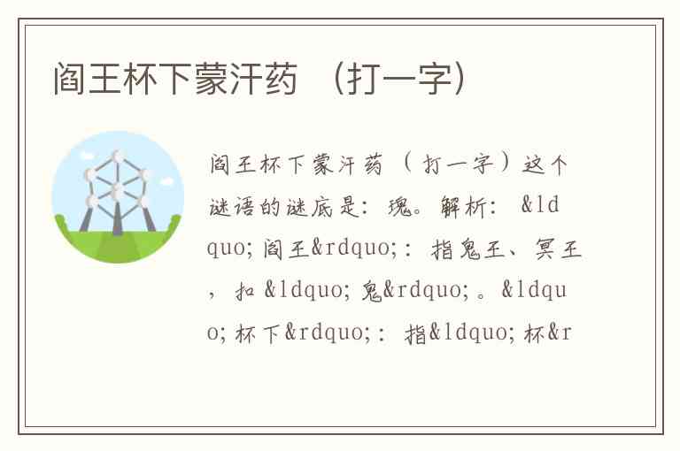 更合理的解法是: “阎王” 扣 “王”(阎王是阴间之王), “杯下” 扣 “不”, “蒙汗药” 会意 “迷” 或 “晕”,但需与“王”“不”组合成字。