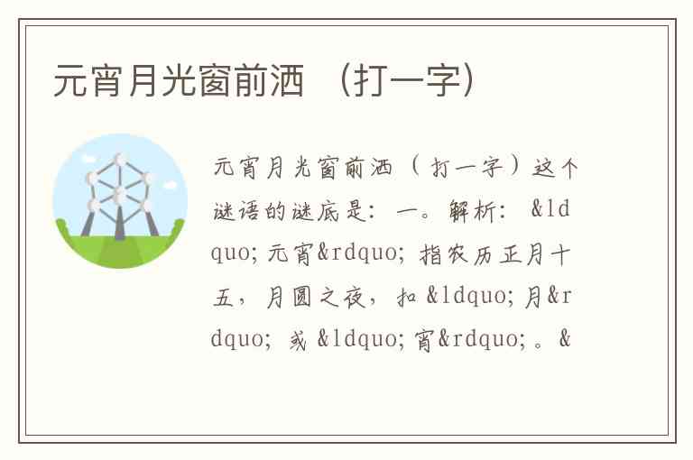 实际上,“元宵月光”可理解为“元”字去掉“儿”(月光消失,即“元”-“儿”=“一”), “窗前洒”可能提示“宀”像窗,但“洒”表示散去,不取字形。
