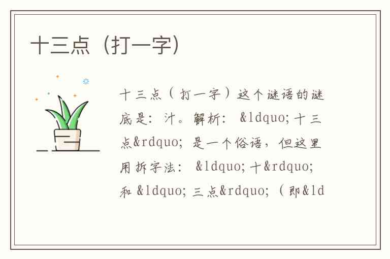 解析: “十三点” 是一个俗语,但这里用拆字法: “十” 和 “三点”(即“氵”三点水)。