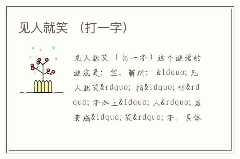 更巧妙的解法: “见人就笑” 意为“竹”字见到“人”就变成“笑”字,因此谜底是 “竹”?但“竹”不是“见人就笑”的结果。