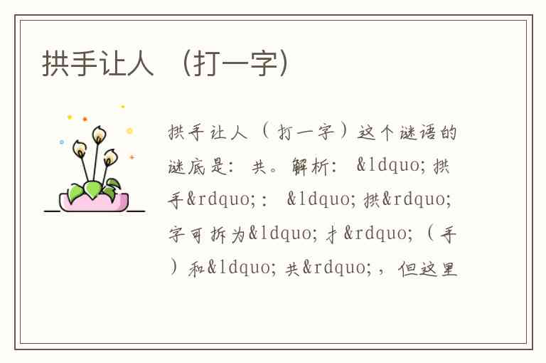 解析: “拱手”: “拱”字可拆为“扌”(手)和“共”,但这里“拱手”表示双手相抱行礼,扣 “扌”?不通。