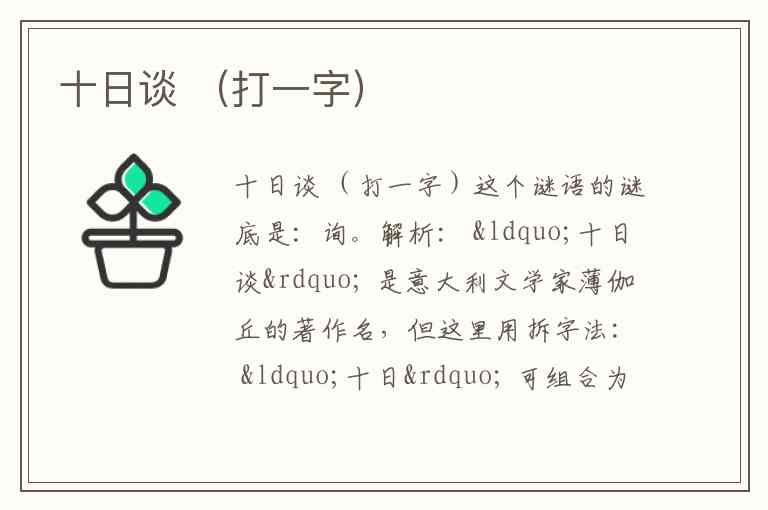 解析: “十日谈” 是意大利文学家薄伽丘的著作名,但这里用拆字法: “十日” 可组合为 “旬”(“十”+“日”=“旬”)。