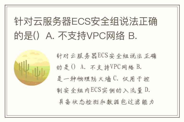 针对云服务器ECS安全组说法正确的是() A. 不支持VPC网络 B. 是一种物理防火墙 C. 仅用于控制安全组内ECS实例的入流量 D. 具备状态检测和数据包过滤能力 答案:D