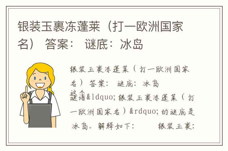 银装玉裹冻蓬莱(打一欧洲国家名) 答案: 谜底:冰岛这个谜语“银装玉裹冻蓬莱(打一欧洲国家名)”的谜底是 冰岛。