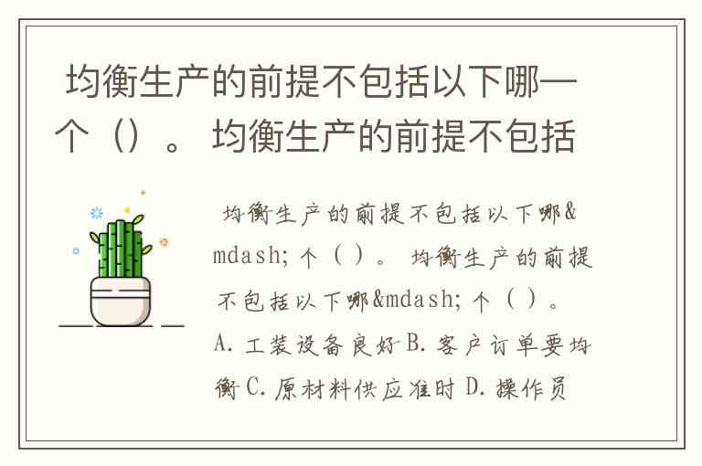B. 客户订单要均衡:这是不正确的。均衡生产的目的之一,恰恰就是为了应对不均衡的客户订单。企业通过生产计划与控制(如建立库存),将不均衡的外部需求转化为内部均衡的生产任务。如果订单天生就是均衡的,那么实现均衡生产的难度会大大降低,但这并非其实现的前提,而是其理想化的外部环境。企业不能控制客户订单,但可以通过内部管理来实现均衡生产。