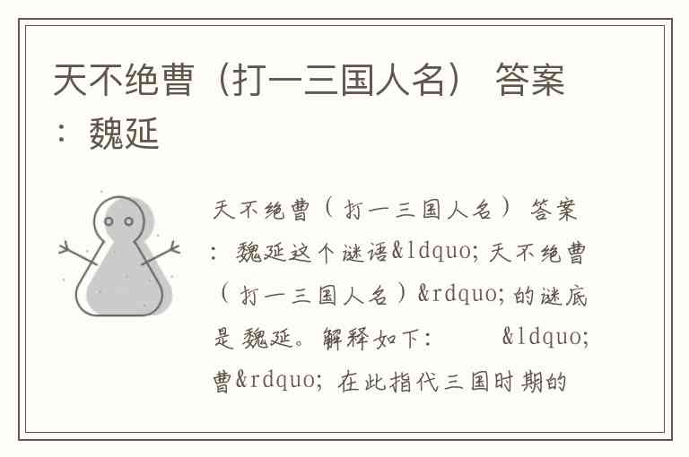 这个谜语“天不绝曹(打一三国人名)”的谜底是 魏延。