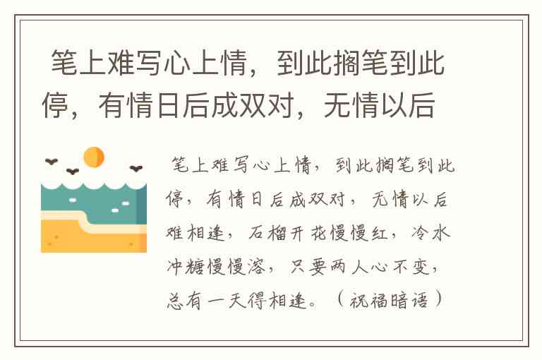 笔上难写心上情,到此搁笔到此停,有情日后成双对,无情以后难相逢,石榴开花慢慢红,冷水冲糖慢慢溶,只要两人心不变,总有一天得相逢。(祝福暗语) 答案: 遥祝明天万事如意
