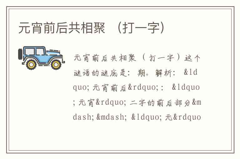 解析: “元宵前后”: “元宵”二字的前后部分—— “元”的前部(开头)是“一”或“二”?不通; 更常见解法:取“元”字的开头 “一”(或“二”)和“宵”字的结尾 “月”?不通。