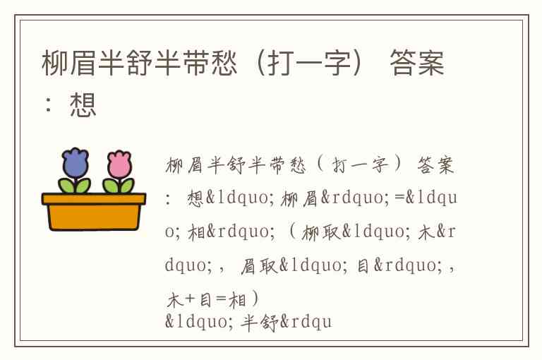 “柳眉”=“相”(柳取“木”,眉取“目”,木+目=相)“半舒”=舍掉一半“舒”,留“予”,但这里可能不取字形,而是“舒”表示“伸展开”,半舒表示不完全展开,暗示“相”不完全,要加东西。“半带愁”=“愁”的一半是“心”,带上“心”→ 相+心=想。