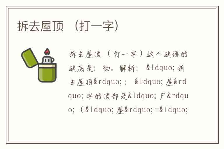 不过按流传答案,“拆去屋顶”扣 “彻”,可能因为: “拆” 字去掉“扌”(视为屋顶)剩“斥”, “斥”与“彻”右半“切”形近?不通。