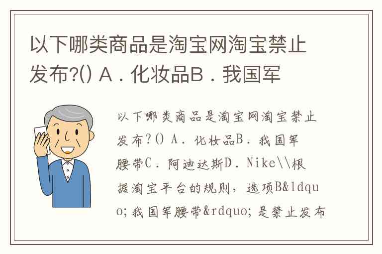 以下哪类商品是淘宝网淘宝禁止发布?() A . 化妆品B . 我国军腰带C . 阿迪达斯D . Nike\