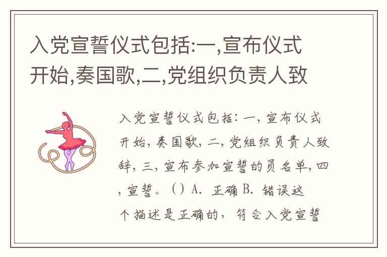 入党宣誓仪式包括:一,宣布仪式开始,奏国歌,二,党组织负责人致辞,三,宣布参加宣誓的员名单,四,宣誓。( ) A. 正确 B. 错误