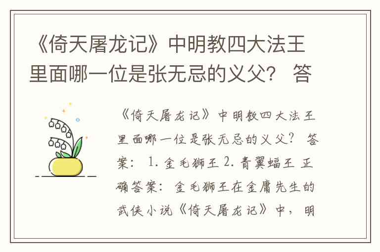 其中,金毛狮王谢逊在流落冰火岛时,与张翠山、殷素素夫妇结为金兰,并认他们刚出生的儿子张无忌为义子。因此,张无忌的义父就是 金毛狮王谢逊。