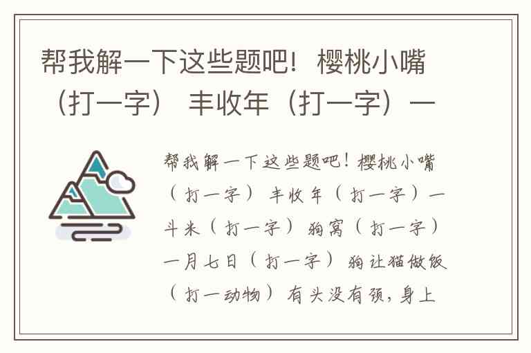 帮我解一下这些题吧! 樱桃小嘴(打一字) 丰收年(打一字)一斗米(打一字) 狗窝(打一字)一月七日(打一字) 狗让猫做饭(打一动物) 有头没有颈,身上冷冰冰,有翅不能飞,无脚也能飞(打一动物)大姐用针不用线,二姐用线不用针,三姐点灯不干活(打一动物)一条狗过了独木桥之后就不叫了(打一成语)八十万禁军谁掌管(打一成语)桃花潭水深千尺(打一成语)