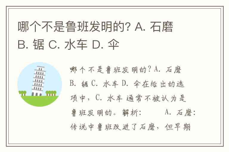 水车在中国历史上的明确记载晚于鲁班所处的春秋战国时期,一般认为水车是东汉以后才出现的。因此,水车不是鲁班的发明。