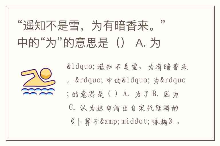 这句诗出自宋代陆游的《卜算子·咏梅》,其中“为有暗香来”中的“为”表示的是 “因为” 的意思。