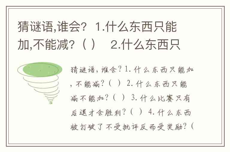 猜谜语,谁会? 1.什么东西只能加,不能减?( ) 2.什么东西只能减不能加?( ) 3.什么比赛只有后退才会胜利?( ) 4.什么东西被打破了不受批评反而受奖励?( ) 5.在阳光下成长.打一个字( ) 6.可上可下,他比你大.打一个字( ) 7.7分钟+8分钟=1000元 打一个成语( )
