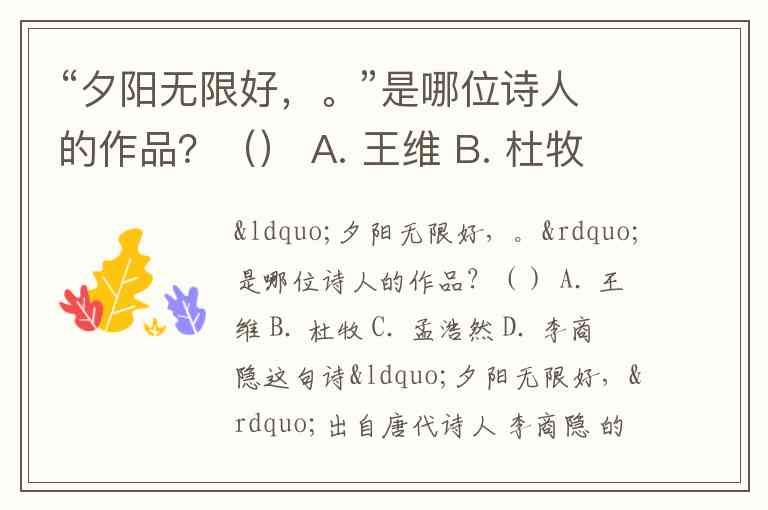 “夕阳无限好,。”是哪位诗人的作品?() A. 王维 B. 杜牧 C. 孟浩然 D. 李商隐
