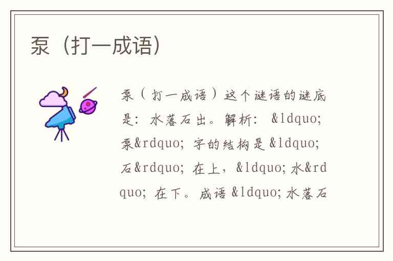 成语 “水落石出” 字面意为水位下降,石头露出,正与“泵”字(石在上,水在下)的结构相呼应。