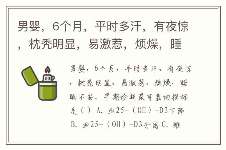 男婴,6个月,平时多汗,有夜惊,枕秃明显,易激惹,烦燥,睡眠不安。早期诊断最可靠的指标是() A. 血25-(OH)-D3下降 B. 血25-(OH)-D3升高 C. 维生素D D. 血清钙、磷 E. 骨密度