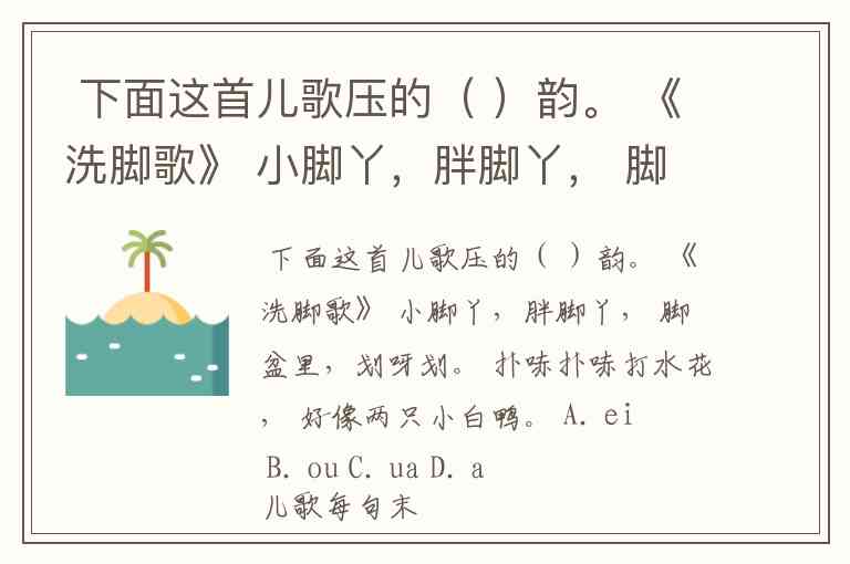 下面这首儿歌压的( )韵。 《洗脚歌》 小脚丫,胖脚丫, 脚盆里,划呀划。 扑哧扑哧打水花, 好像两只小白鸭。 A. ei B. ou C. ua D. a