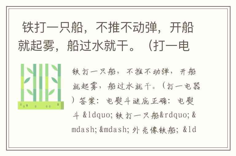 谜底正确:电熨斗 “铁打一只船”——外壳像铁船; “不推不动弹”——要靠人手推动; “开船就起雾”——加热后冒出蒸汽; “船过水就干”——熨过之处湿衣即干。解析:欧洲人自从17世纪以来就自己熨烫衣服了。他们用一块挺重的“平底铁”在火中或热金属板上加热后来熨烫衣服。
