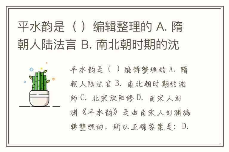 平水韵是( )编辑整理的 A. 隋朝人陆法言 B. 南北朝时期的沈约 C. 北宋欧阳修 D. 南宋人刘渊