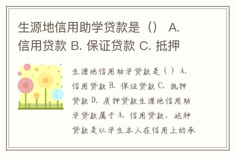 生源地信用助学贷款是() A. 信用贷款 B. 保证贷款 C. 抵押贷款 D. 质押贷款