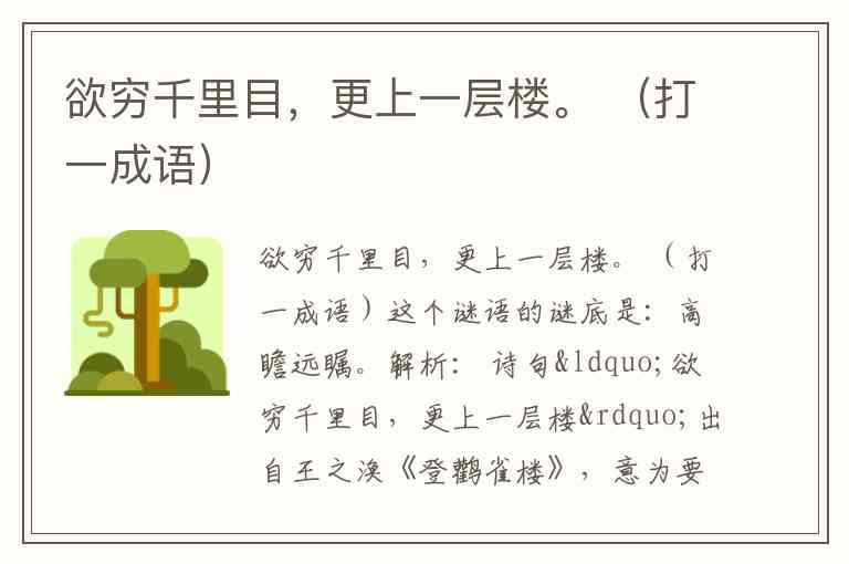 解析: 诗句“欲穷千里目,更上一层楼”出自王之涣《登鹳雀楼》,意为要想看得更远,就要登上更高的楼层。