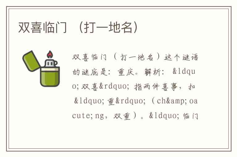 合起来即中国直辖市 重庆,同时“重庆”字面可解为“双重喜庆”,与谜面完美呼应。