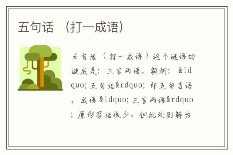 成语 “三言两语” 原形容话很少,但此处别解为 “三句 + 两句 = 五句话”,通过数字相加与谜面呼应。