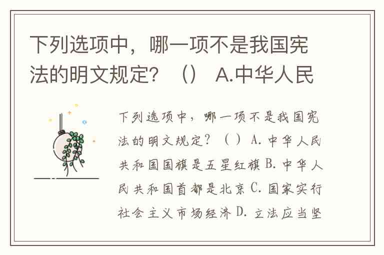 下列选项中,哪一项不是我国宪法的明文规定?() A.中华人民共和国国旗是五星红旗 B.中华人民共和国首都是北京 C.国家实行社会主义市场经济 D.立法应当坚持和发展全过程人民民主