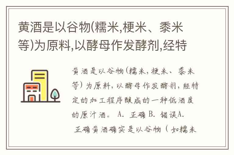 黄酒是以谷物(糯米,梗米、黍米等)为原料,以酵母作发酵剂,经特定的加工程序酿成的一种低酒度的原汁酒。 A. 正确 B. 错误